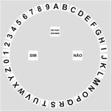 - Monte um círculo com todas as letras do alfabeto e números de 0 a 9 e coloque no centro as palavras "sim", "não" e "não posso responder", tudo sobre uma superficie o mais plana possivel, como mostra a figura: